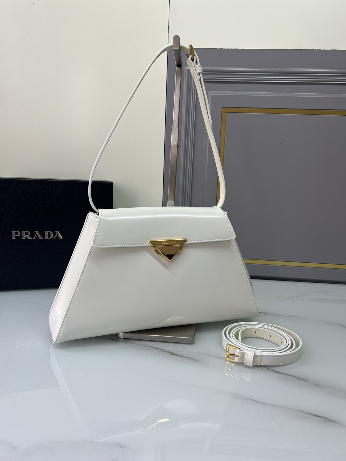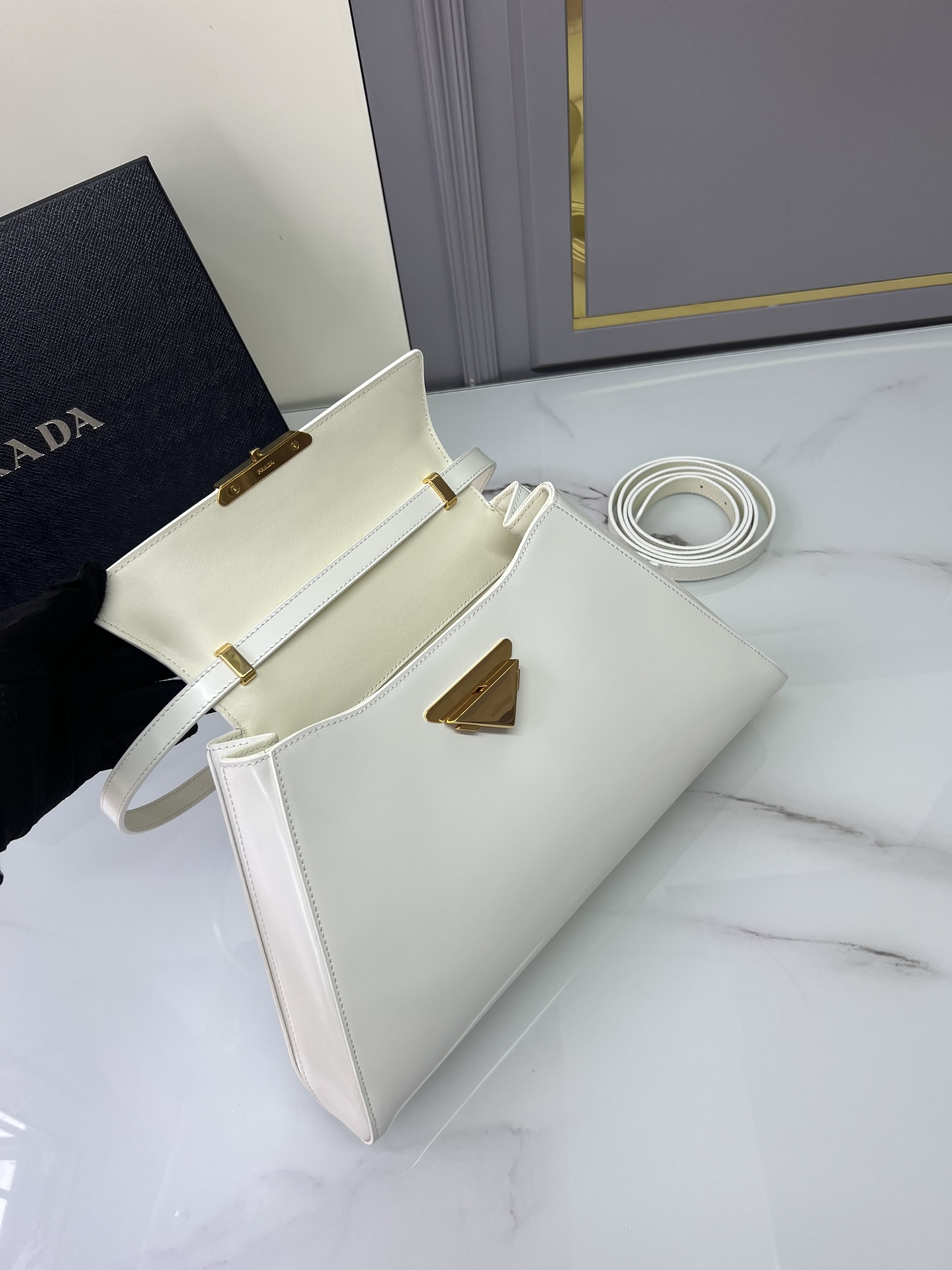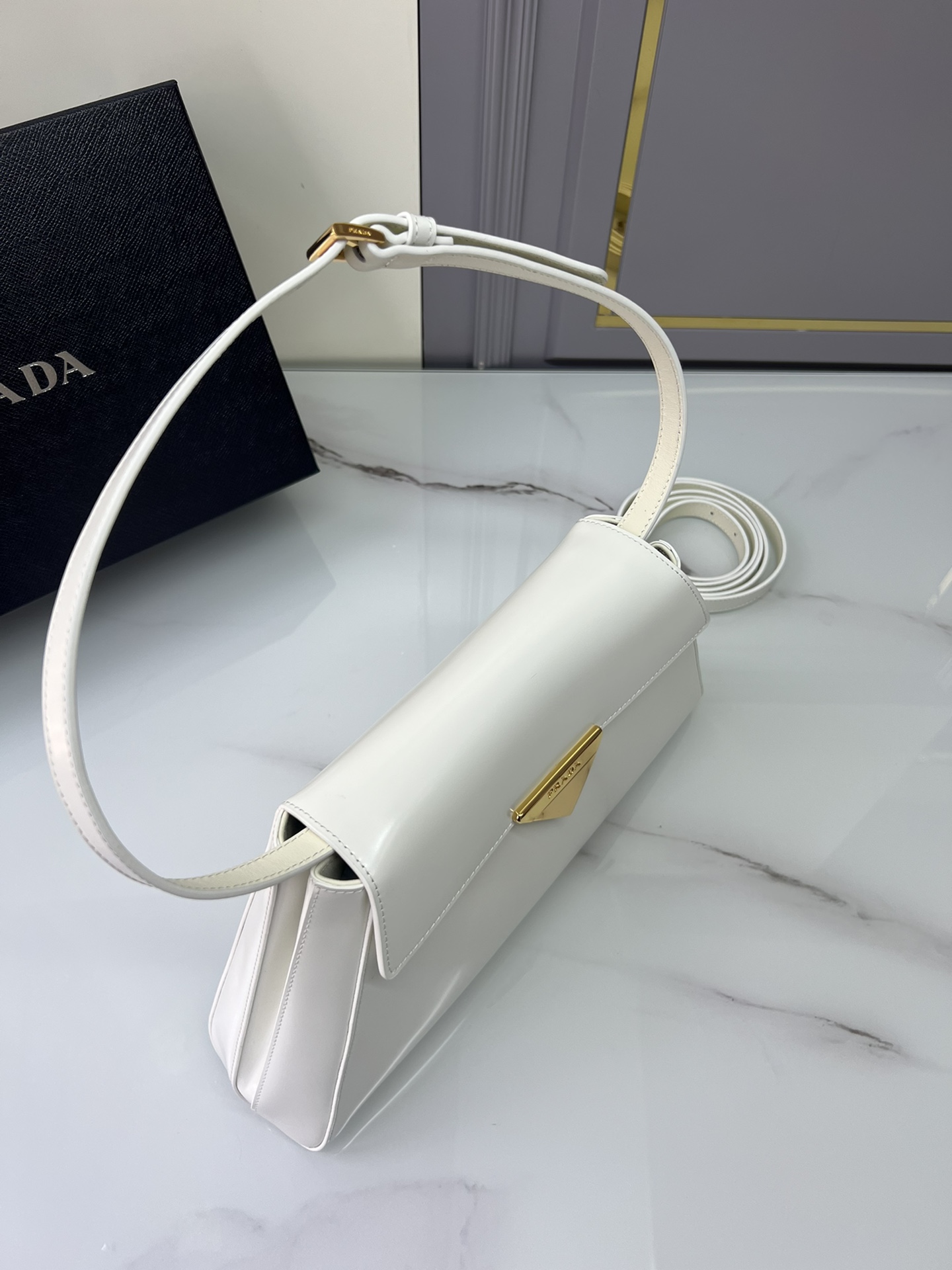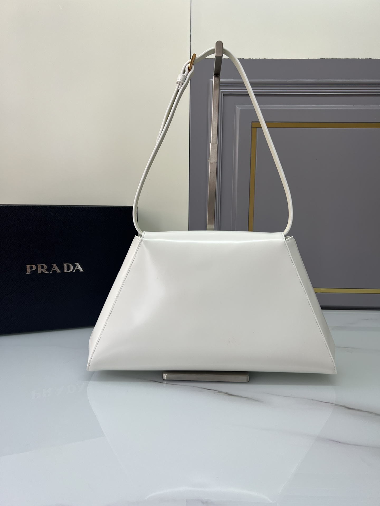 New Prada 🎉 Runway style 🎉 1bd342 New 🎉🎉 This runway style features imported glossy calf leather, paired with sheepskin. The trapezoidal design is full of artistic sense, equipped with two detachable shoulder straps of long and short length, and the front panel is equipped with engraved micro label lock head flip design, which can be exchanged and paired for different occasions and clothing. Large capacity space. For upper body effect bars, if you like babies, hurry up and get started 🎉🎉 Length 34x Height 19x Bottom 8cm