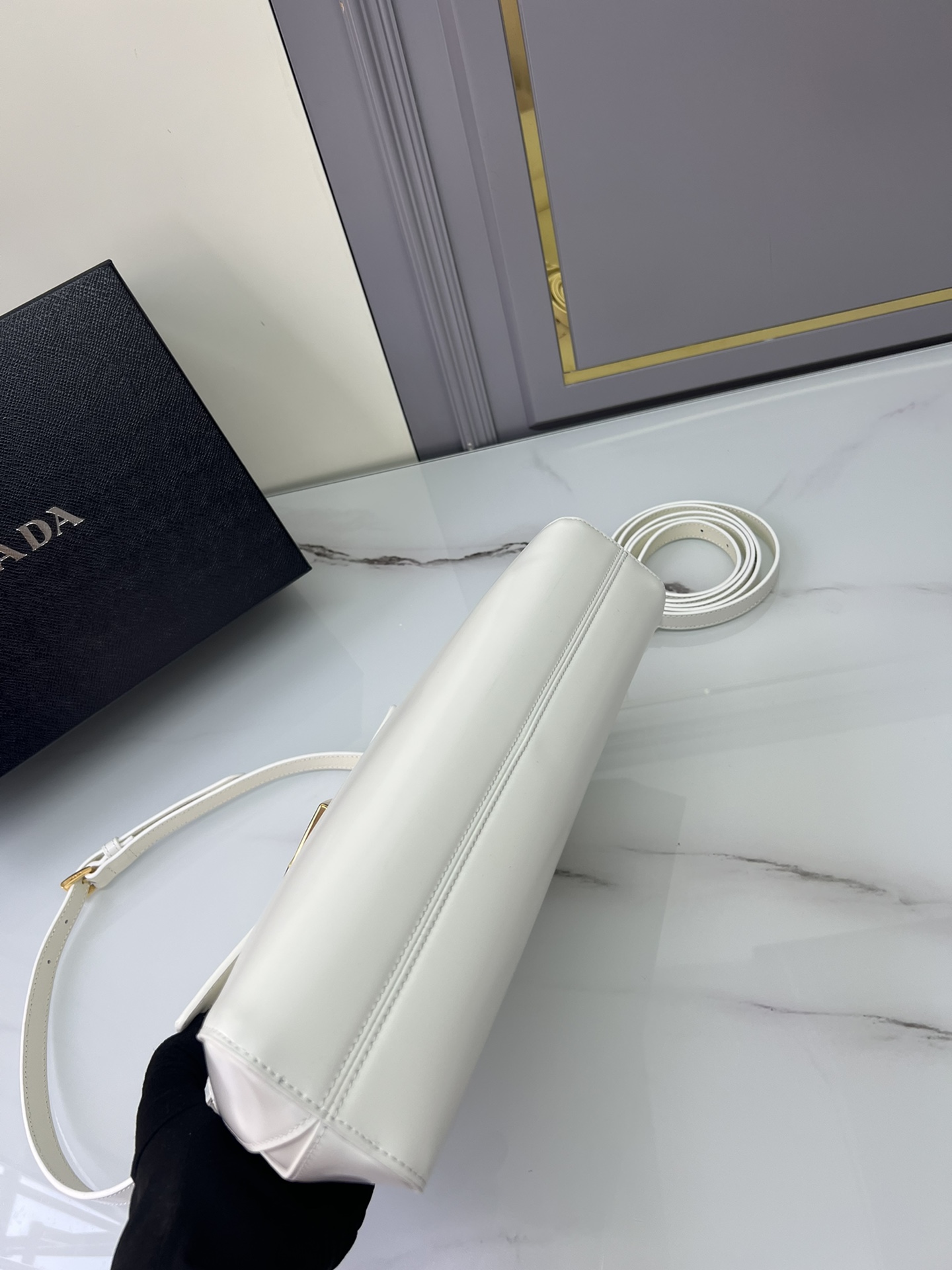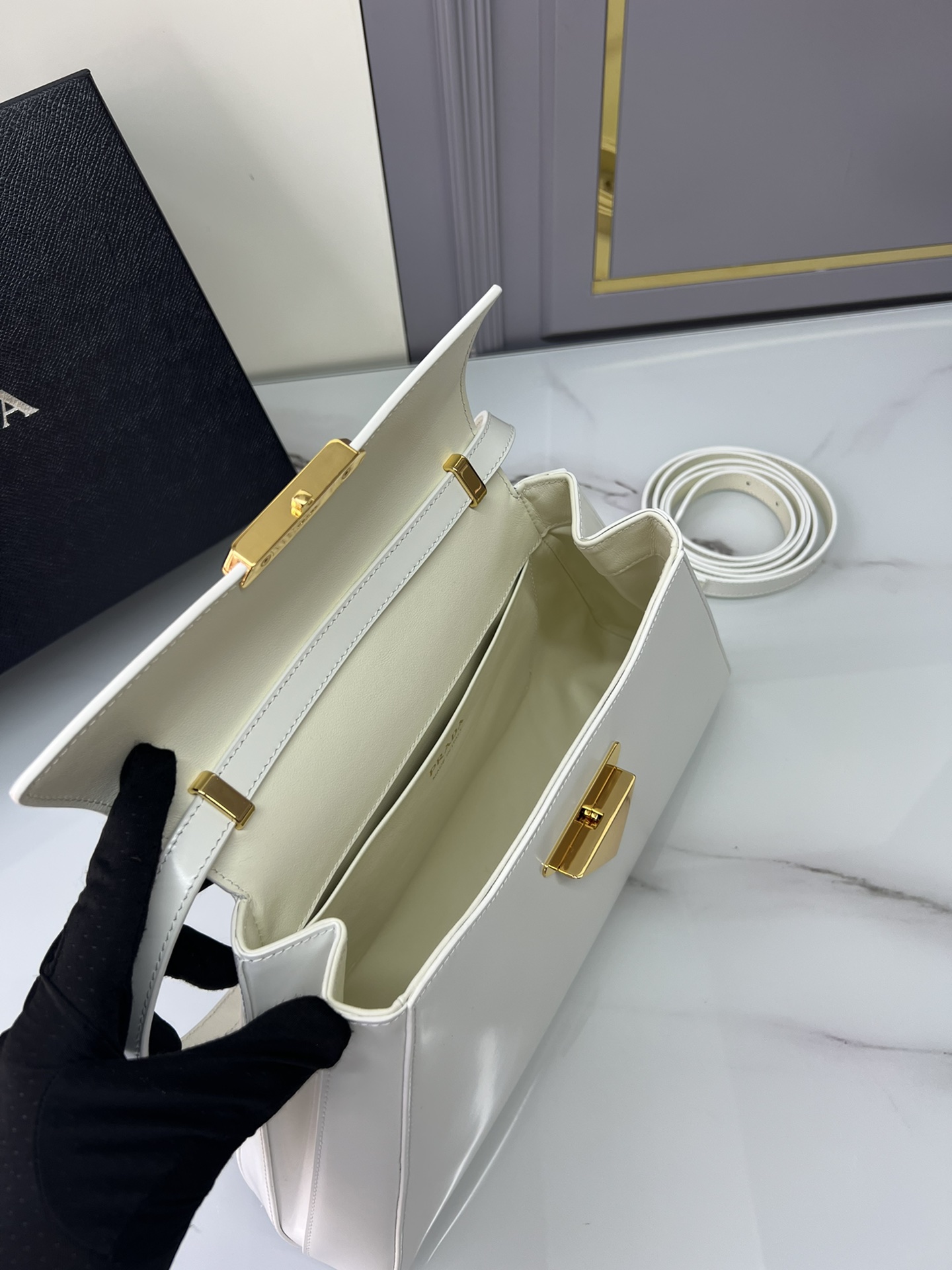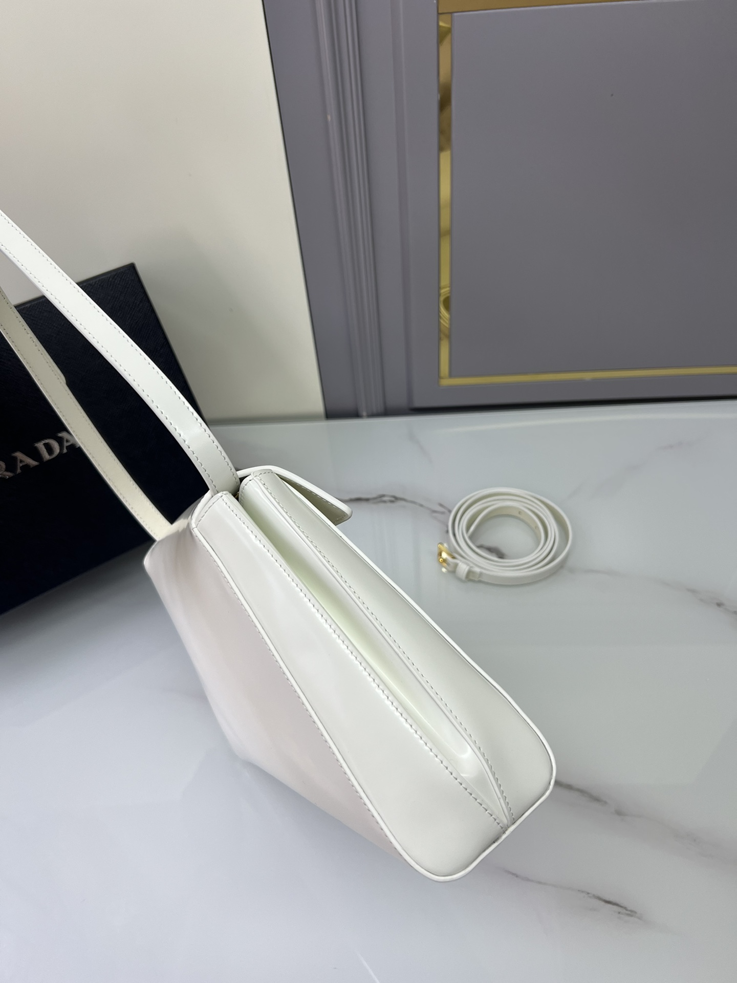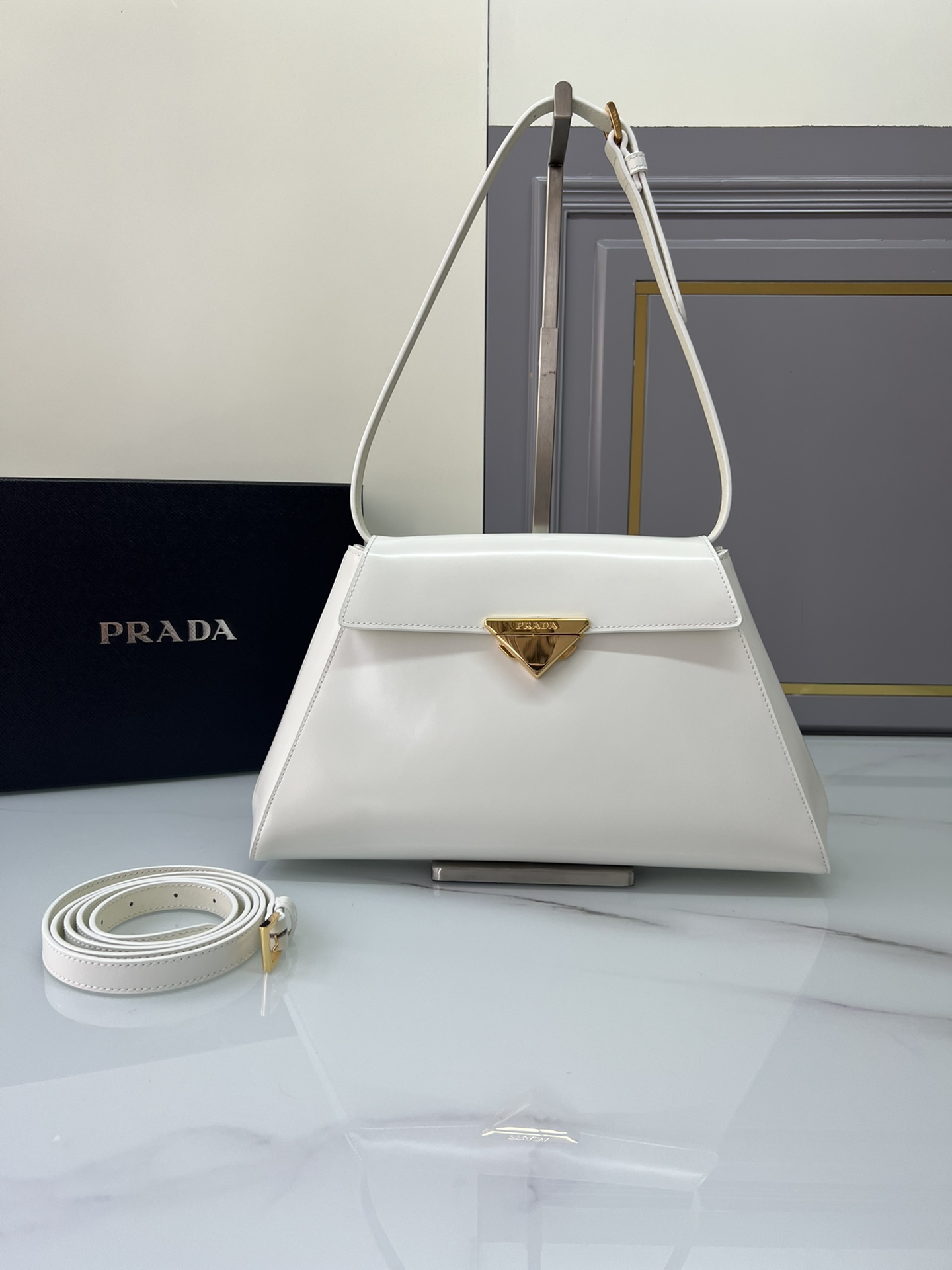 New Prada 🎉 Runway style 🎉 1bd342 New 🎉🎉 This runway style features imported glossy calf leather, paired with sheepskin. The trapezoidal design is full of artistic sense, equipped with two detachable shoulder straps of long and short length, and the front panel is equipped with engraved micro label lock head flip design, which can be exchanged and paired for different occasions and clothing. Large capacity space. For upper body effect bars, if you like babies, hurry up and get started 🎉🎉 Length 34x Height 19x Bottom 8cm